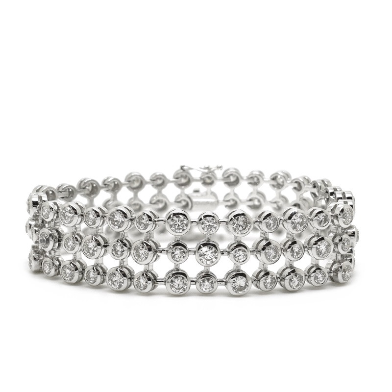 Brazalete tipo riviere de tres filas en oro blanco de 18 quilates con diamantes en talla brillante engastados en chatón (14.41 ct).