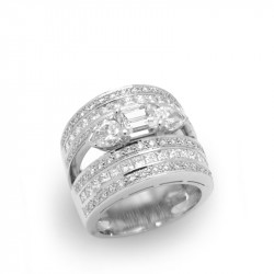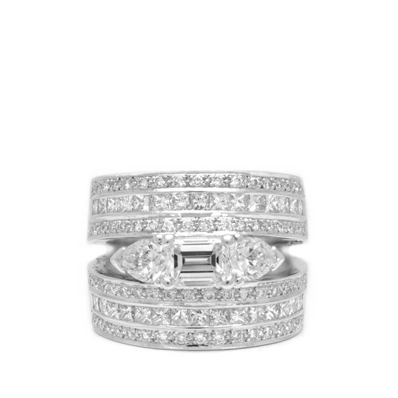 Anillo de brazo doble en oro blanco de 18 quilates con diamantes en talla brillante (0.47 ct) y talla princesa (0.96 ct). En el centro lleva dos diamantes en talla pera (0.85 ct) y un diamante en talla esmeralda (0.91 ct).