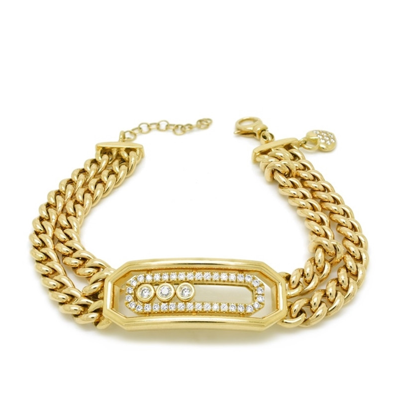 Pulsera en oro amarillo de 18 quilates con doble cadena tipo barbada y motivo de diamantes en talla brillante (0.77 ct).