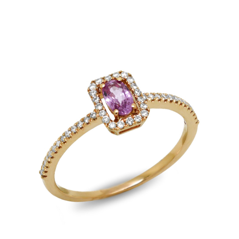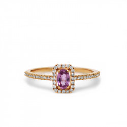 Anillo en oro rosa de 18 quilates, diamantes talla brillante (0.15 ct) y zafiro rosa (0.25 ct).
