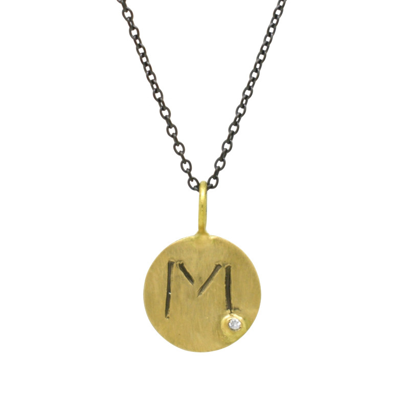 Colgante de chapa redonda en oro amarillo de 18 quilates con acabado mate y un diamante en talla brillante. LLeva una cadena de acero negro de 42 cm.