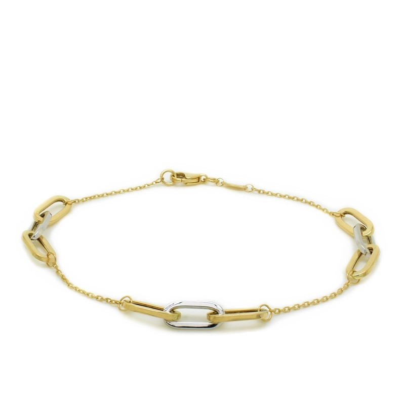 Pulsera de cadena con 9 eslabones en oro amarillo y blanco de 18 quilates. Tiene un largo de 19 cm.