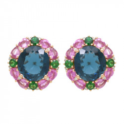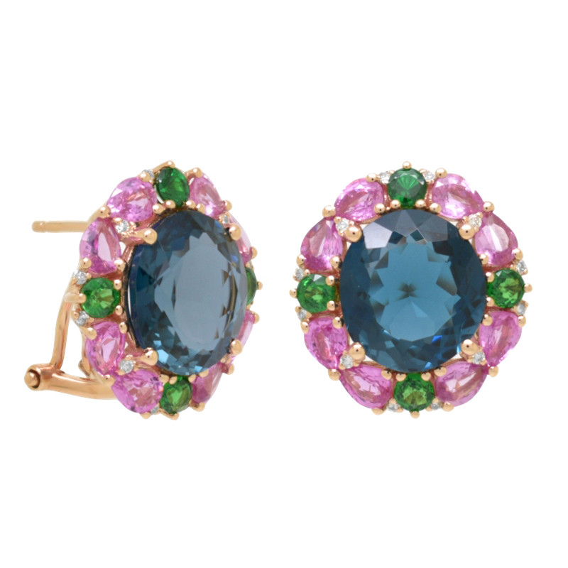 Pendientes en oro rosa de 18 quilates con diamantes en talla brillante (0.12 ct), zafiro rosa (3.08 ct), tsavorita (0.84 ct) y topacio london blue (8.62 ct).