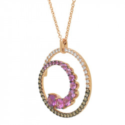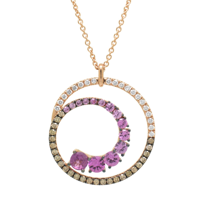 Colgante con forma de espiral en oro rosa de 18 quilates con diamantes blancos y marrones en talla brillante (0.81 ct) y zafiros rosas (2.49 ct). Lleva una cadena de 42 cm.