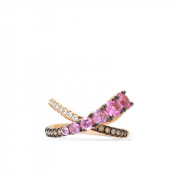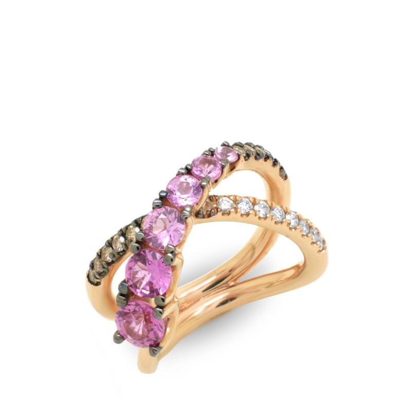 Anillo en oro rosa de 18 quilates con diamantes blancos y marrones en talla brillante (0.36 ct) y zafiros rosas (1.41 ct).