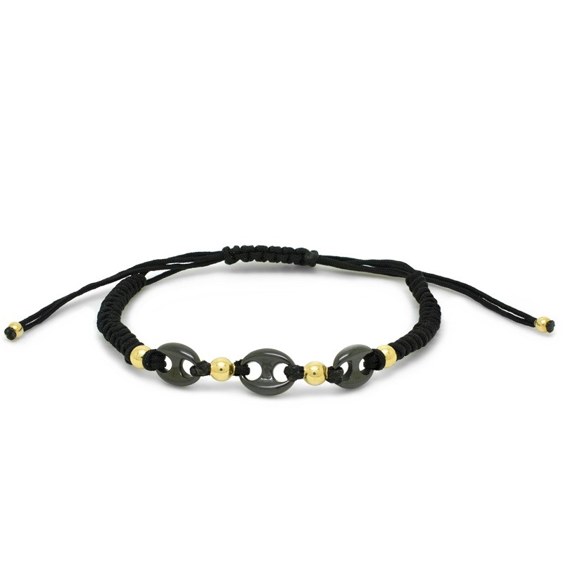Pulsera de macramé negro con bolas en oro amarillo de 18 quilates y motivo de calabrote de cerámica negra.