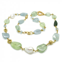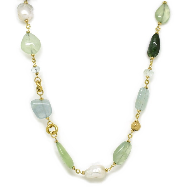 Collar en oro amarillo de 18 quilates, turmalinas, aguamarinas y perlas barrocas.