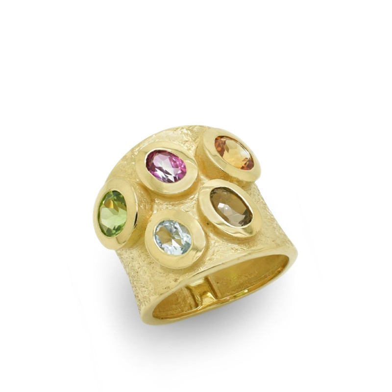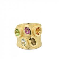 Anillo ancho en oro amarillo de 18 quilates con acabado brillo/mate y piedras multicolor en talla redonda y oval.