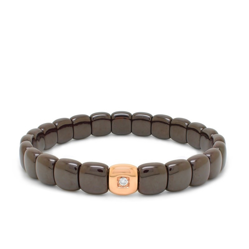 Pulsera elástica de cerámica marrón y motivo de oro rosa de 18 quilates con un diamante en talla brillante (0.05 ct).