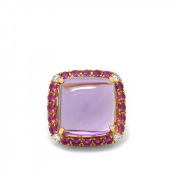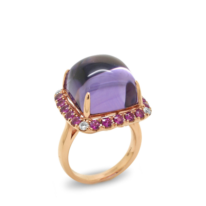 Anillo en oro rosa de 18 quilates, amatista en talla cabujón alto (18.84 ct), rubíes (1.11 ct) y diamantes en talla brillante (0.17 ct).