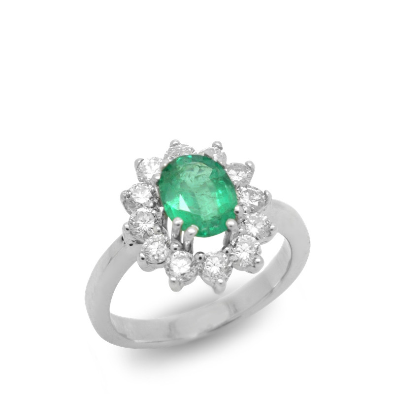 Anillo en oro blanco de 18 quilates, diamantes en talla brillante (1.08 ct) y esmeralda oval.