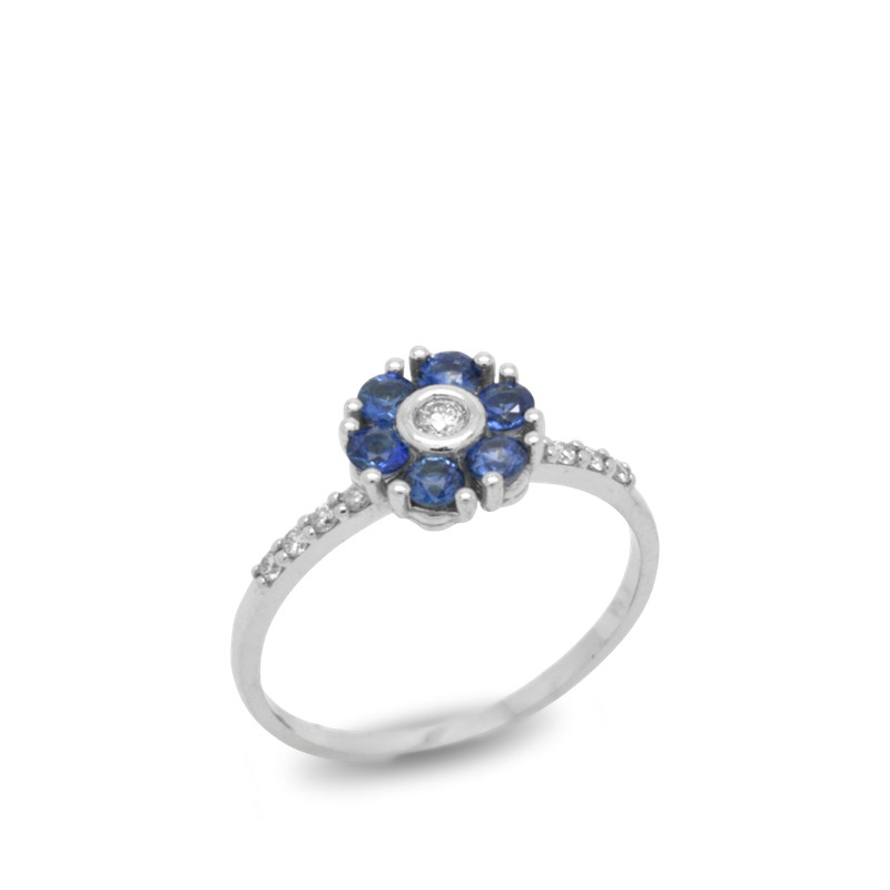 Anillo en oro blanco de 18 quilates, diamantes en talla brillante (0.13 ct) y un zafiros.