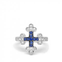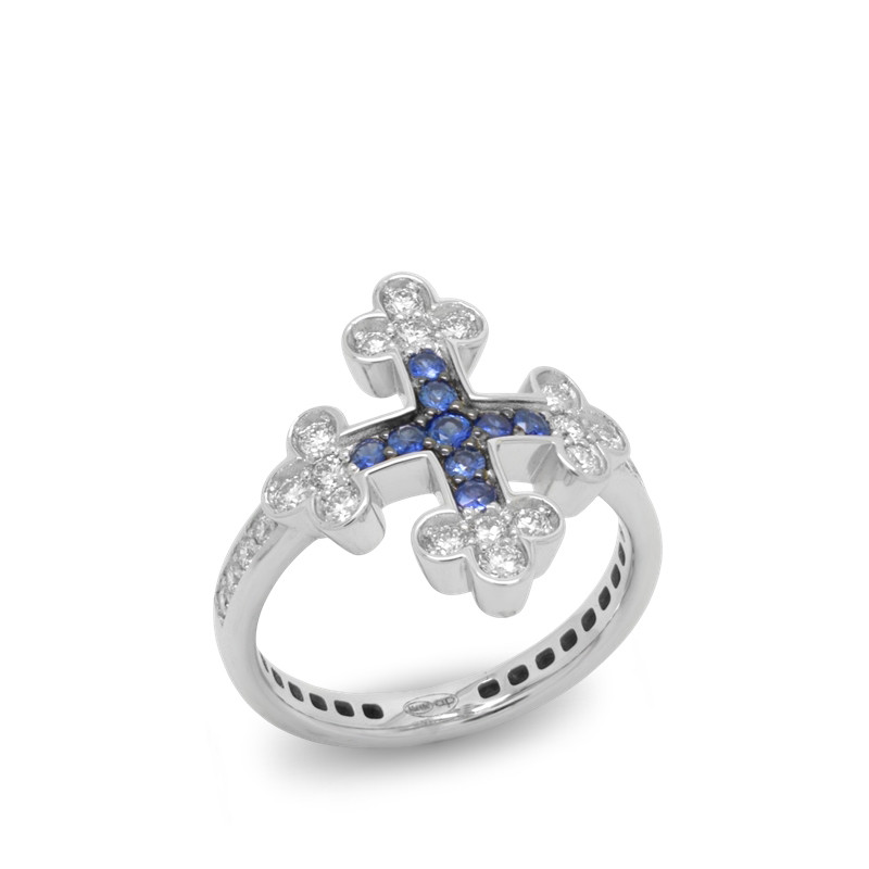 Anillo con motivo cruz en oro blanco de 18 quilates, diamantes talla brillante (0.45 ct) y zafiros (0.23 ct).