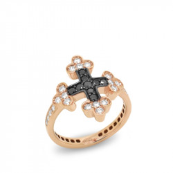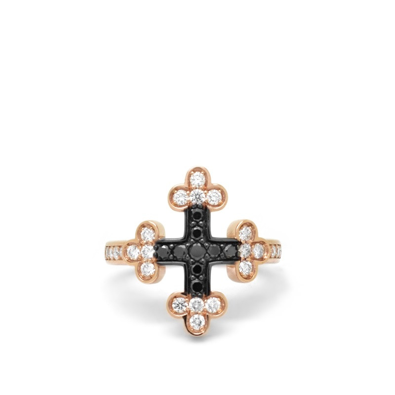 Anillo con motivo cruz en oro rosa de 18 quilates, diamantes en talla brillante (0.41 ct) y diamantes negros (0.22 ct).