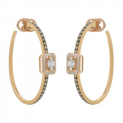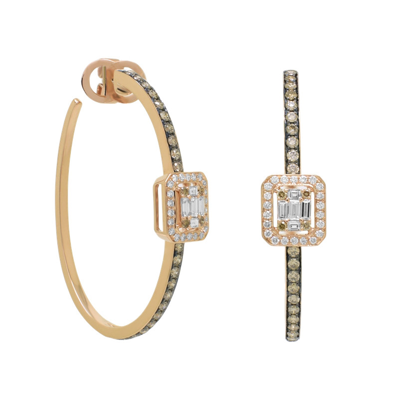 Pendientes tipo aro abierto en oro rosa de 18 quilates con diamantes en talla brillante y baguette (0.40 ct) y diamantes marrones (0.77 ct).