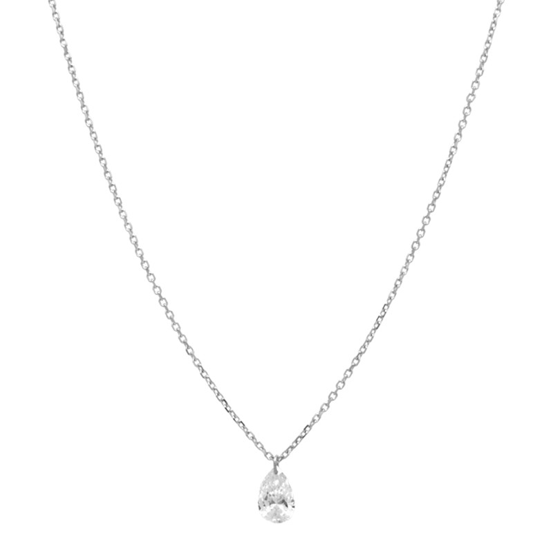 Gargantilla en oro blanco de 18 quilates y un diamante perforado en talla pera de 0.25 ct. Tiene un largo de 42 cm con anilla a 40 cm.
