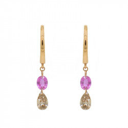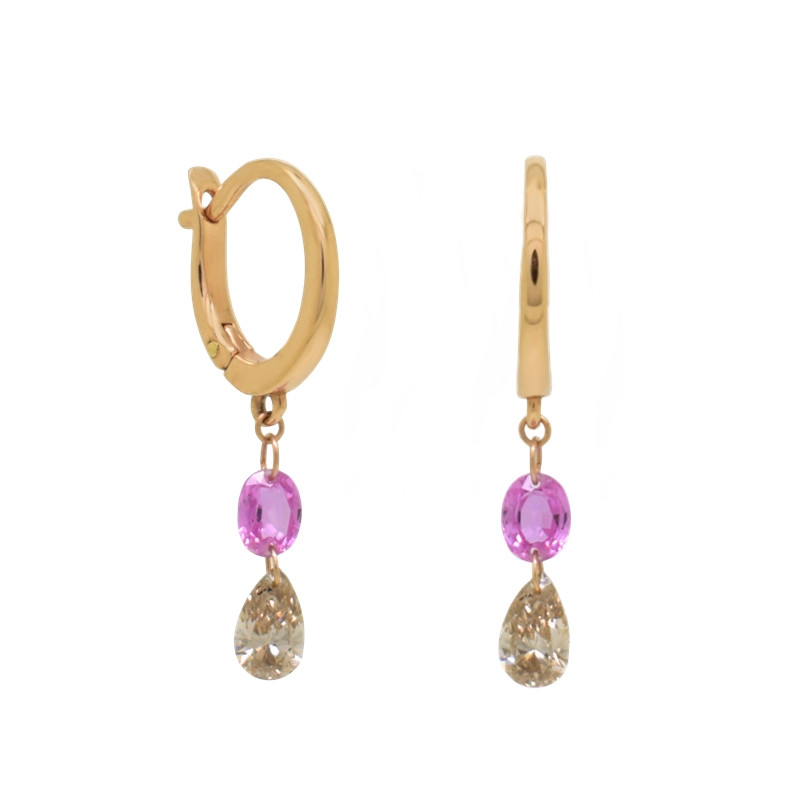 Pendientes en oro rosa de 18 quilates, zafiro rosa oval (0.60 ct) y diamante marrón en talla pera (0.60 ct).