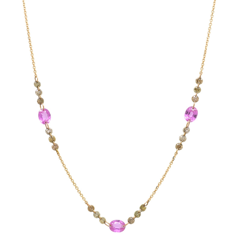 Gargantilla en oro rosa de 18 quilates, zafiro rosa oval (1.05 ct) y diamante marrón en talla brillante (0.54 ct). Tiene un largo de 42 cm con anilla a 40 cm.