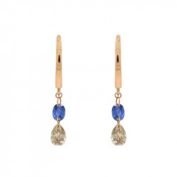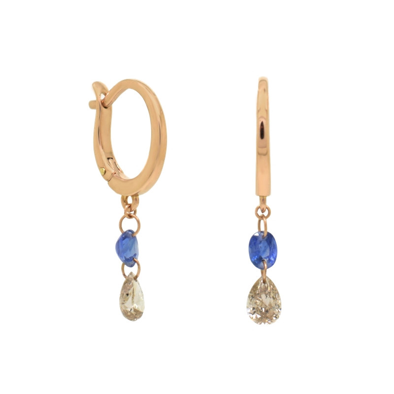 Pendientes en oro rosa de 18 quilates, zafiro azul oval (0.45 ct) y diamante marrón en talla pera (0.60 ct).