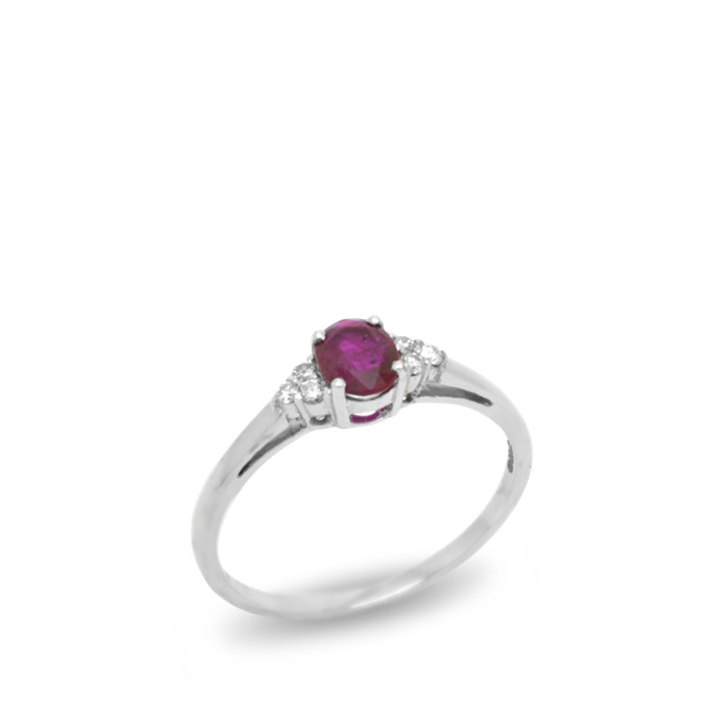 Anillo en oro blanco de 18 quilates, diamantes en talla brillante (0.05 ct) y rubí oval (0.30 ct).