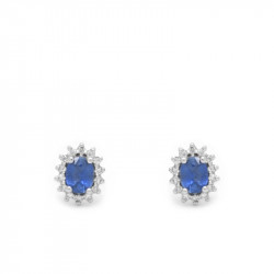 Pendientes en oro blanco de 18 quilates, zafiro oval (0.42 ct) y una orla de diamantes en talla brillante (0.11 ct).