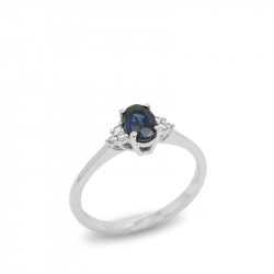 Anillo en oro blanco de 18 quilates, centro de zafiro oval (0.65 ct) y 6 diamantes en talla brillante (0.06 ct).