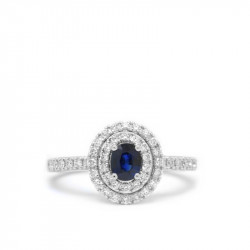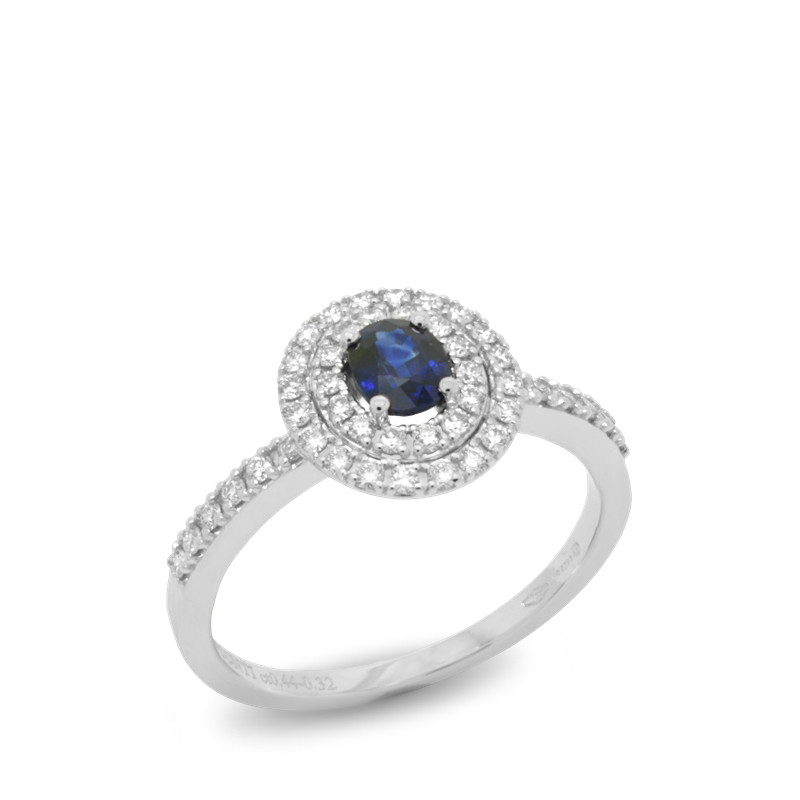 Anillo de la firma Mirco Visconti. Realizado en oro blanco de 18 quilates con doble orla de diamantes en talla brillante (0.32 ct) y un zafiro oval (0.44 ct).