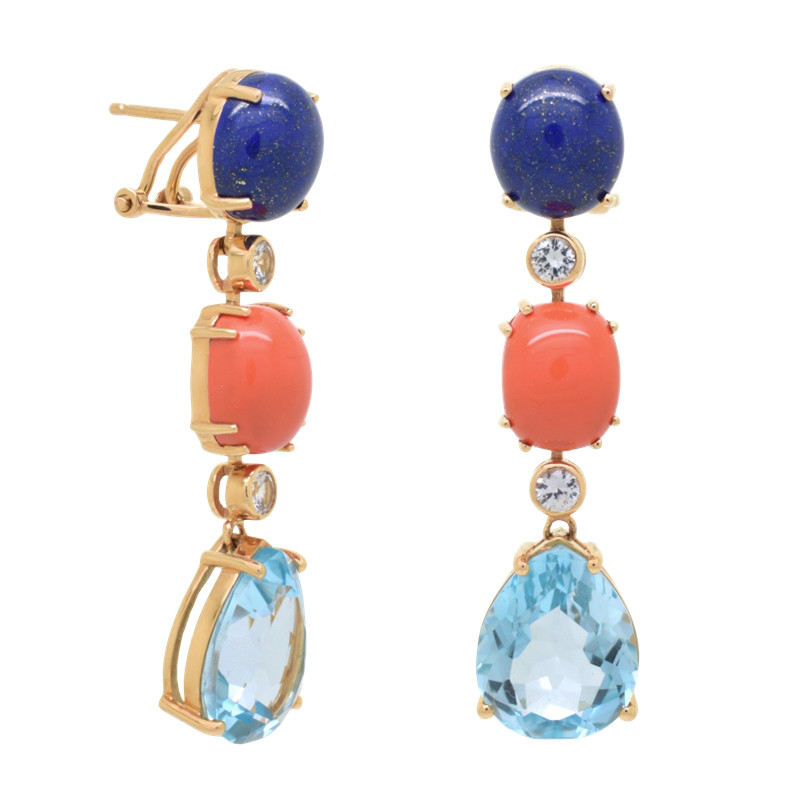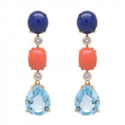 Pendientes largos de color en oro rosa de 18 quilates, lapislázuli, coral, topacio azul y 4 zafiros blancos (0.51 ct).