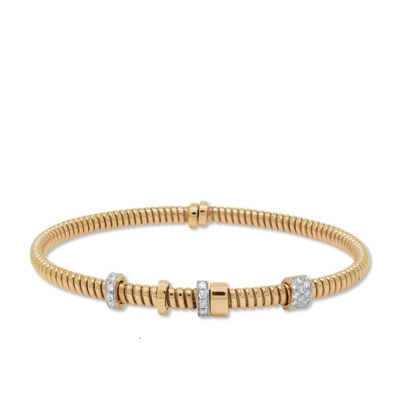 Pulsera de la firma K di Kuore tipo tubogas en oro rosa de 18 quilates. Tiene tres motivos fijos con diamantes en talla brillante (0.18 ct) y dos motivos lisos con movimiento.