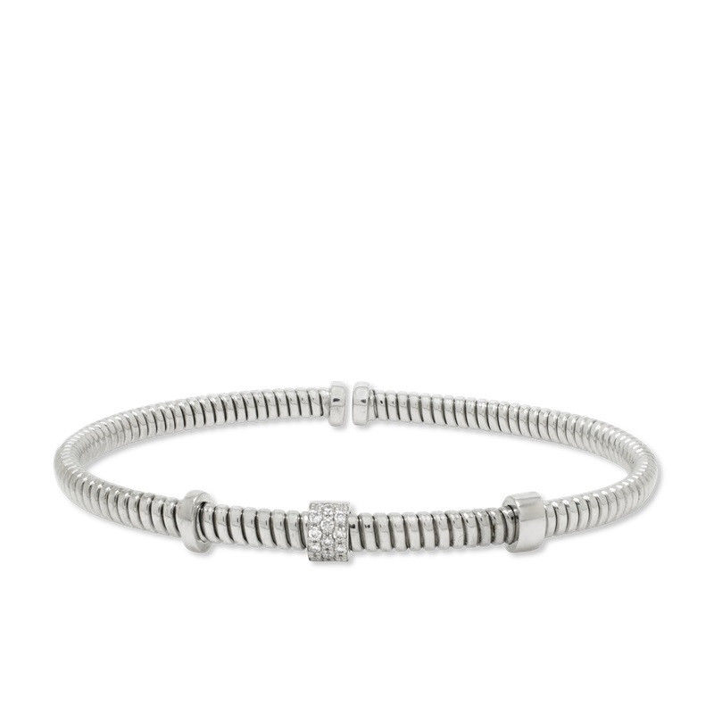 Pulsera de la firma K di Kuore tipo tubogas en oro blanco de 18 quilates. Tiene un motivo con movimiento con diamantes en talla brillante (0.10 ct) y dos motivos lisos fijos.