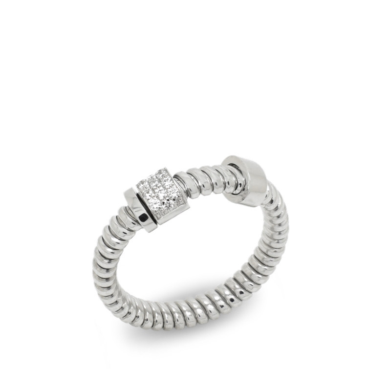 Anillo de la firma K di Kuore tipo tubogas en oro blanco de 18 quilates. Tiene un motivo con movimiento de diamantes en talla brillante (0.10 ct) y dos motivos lisos fijos.