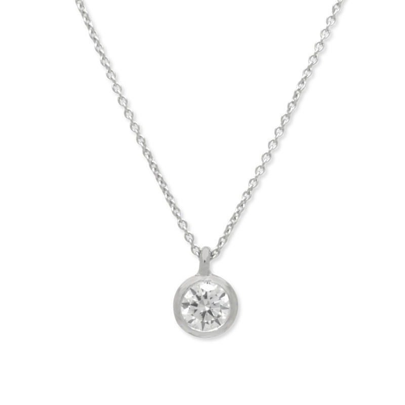 Colgante tipo donut en oro blanco de 18 quilates y un diamante natural certificado talla brillante (0.24 ct), con cadena de 42 cm.