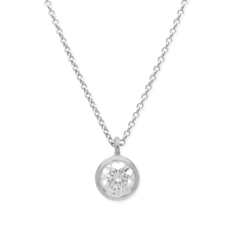 Colgante tipo donut en oro blanco de 18 quilates y un diamante natural certificado talla brillante (0.40 ct), con cadena de 44 cm regulables.