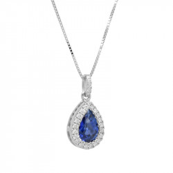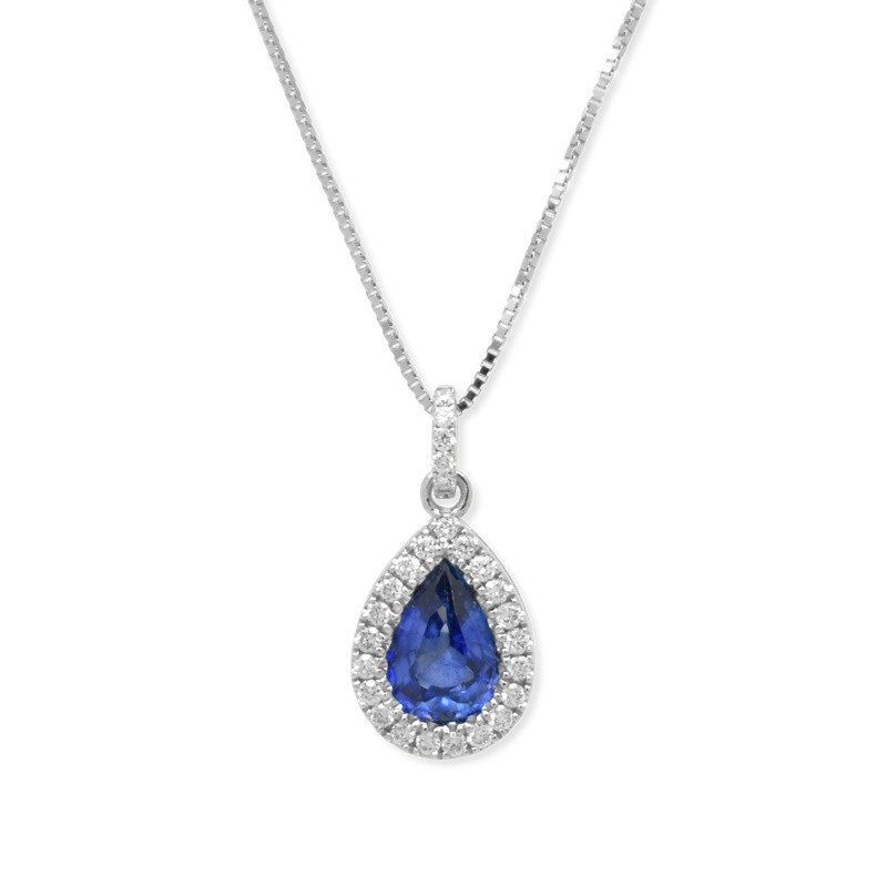 Colgante en oro blanco de 18 quilates, diamantes en talla brillante (0.13 ct) y un zafiro talla pera (0.84 ct), con cadena tipo veneciana de 45 cm.