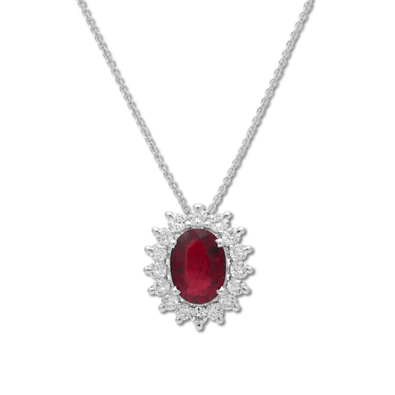 Colgante en oro blanco de 18 quilates, centro de rubí oval (0.70 ct) y orla de diamantes en talla brillante (0.20 ct). Lleva una cadena de 42 cm.