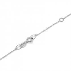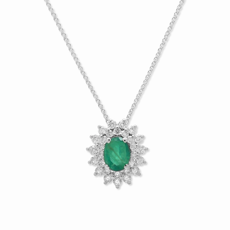 Colgante en oro blanco de 18 quilates, centro de esmeralda oval (0.40 ct) y dos orlas de diamantes en talla brillante (0.31 ct). Lleva una cadena de 42 cm.