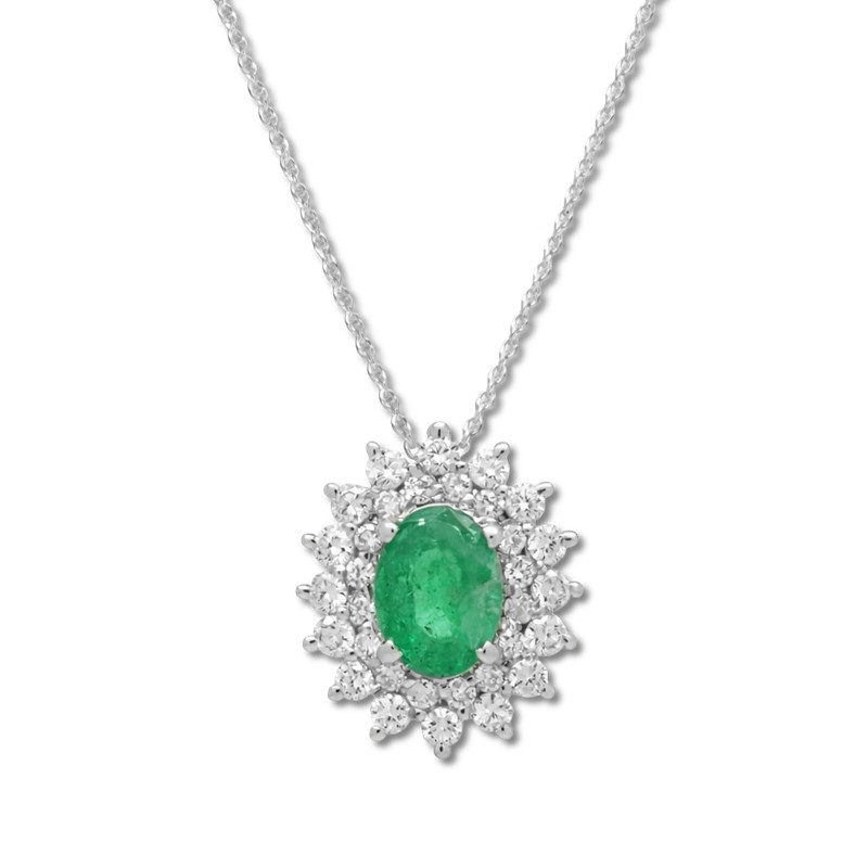 Colgante en oro blanco de 18 quilates, centro de esmeralda oval (0.70 ct) y dos orlas de diamantes en talla brillante (0.37 ct). Lleva una cadena de 42 cm.