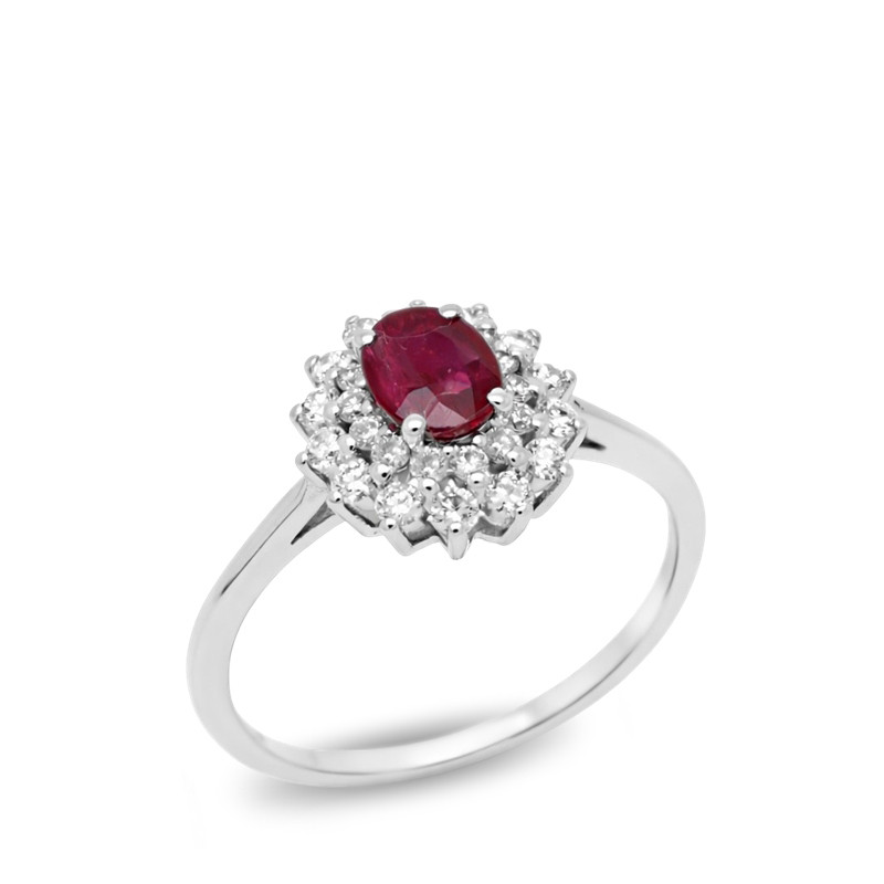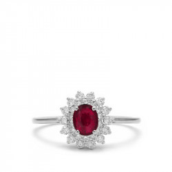 Anillo en oro blanco de 18 quilates con un rubí oval (0.47 ct) y dos orlas de diamantes en talla brillante (0.21 ct).
