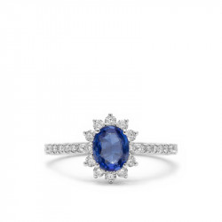 Anillo en oro blanco de 18 quilates con un zafiro oval (0.70 ct) y diamantes en talla brillante (0.37 ct).
