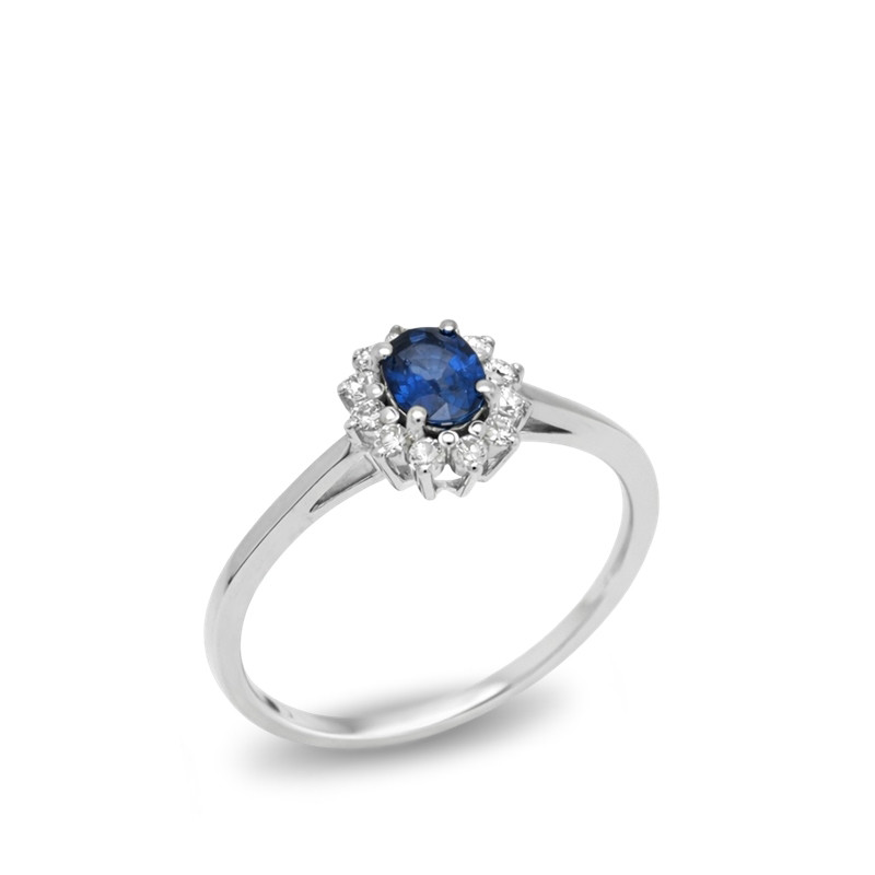 Anillo en oro blanco de 18 quilates, zafiro (0.40 ct) y diamantes en talla brillante (0.15 ct).